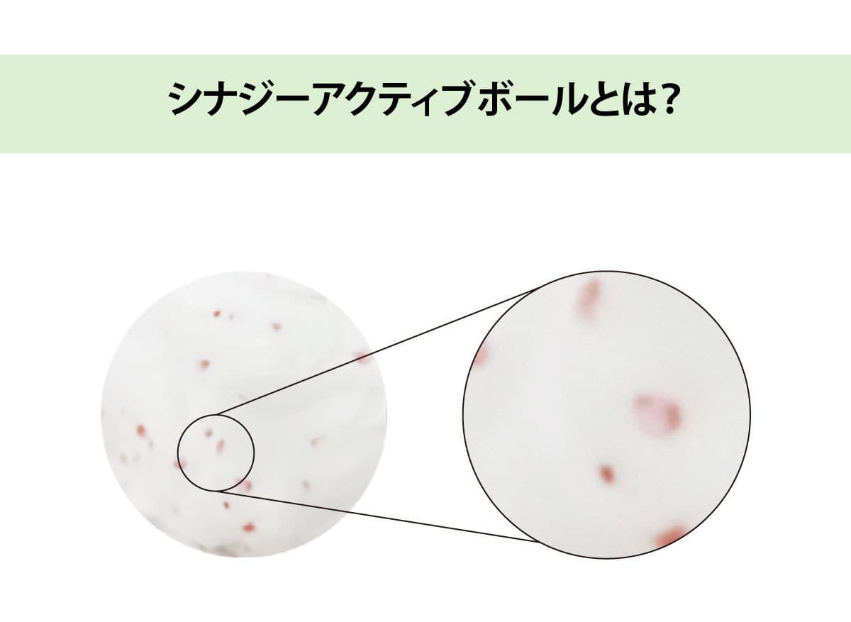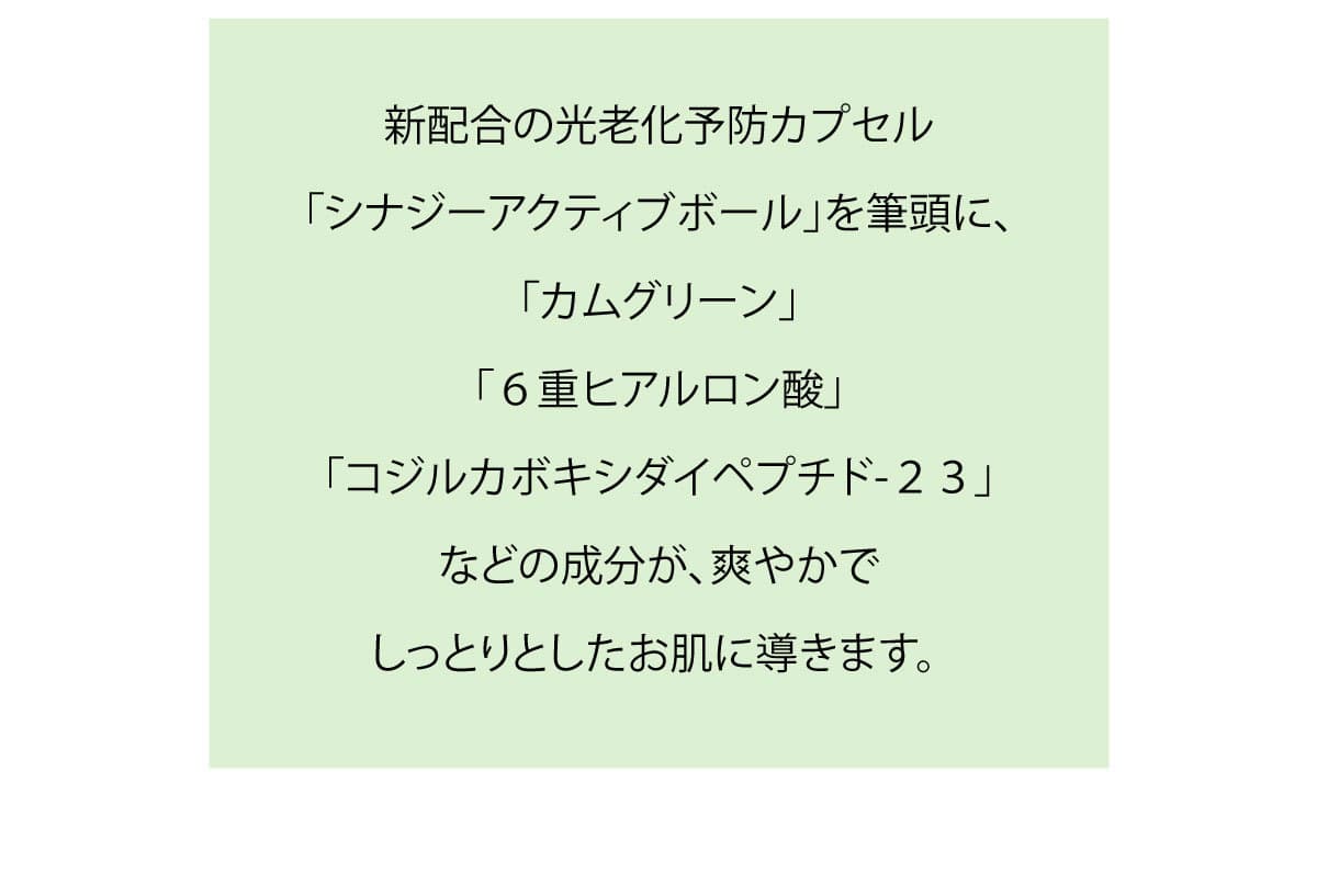 シナジーアクティブボールが光老化を予防し、紫外線による紅斑や肌への刺激を緩和させ、成分を安全にお肌へ届けます。
