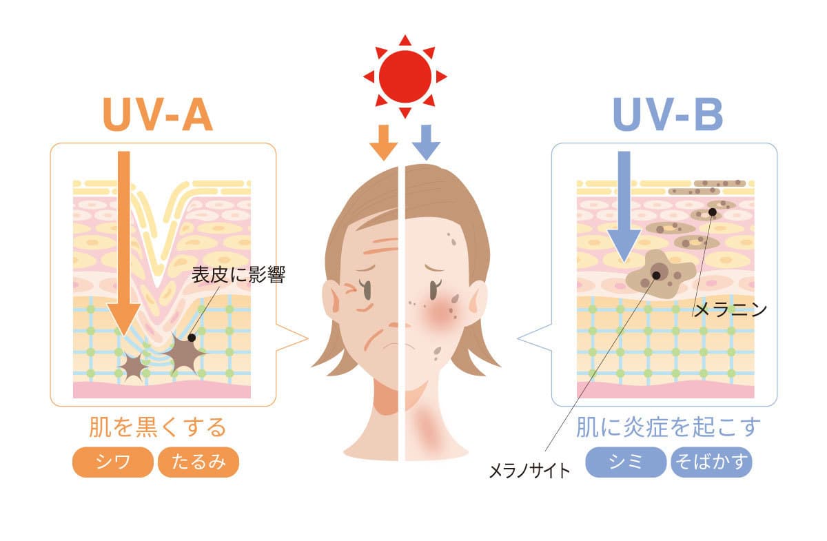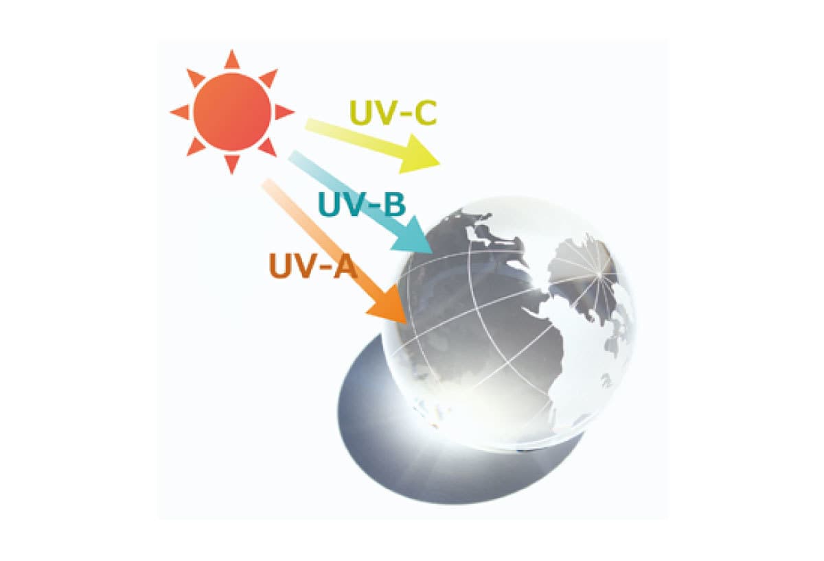 紫外線は英語で「Ultraviolet rays(ウルトラ バイオレット)」といい、略して『UV』と呼びます。波長の長さによって、「UV-A」、「UV-B」、「UV-C」の3つに分けられます。このうち「UV-C」は、オゾン層などに遮られて地表まで届かないため、わたしたちの体に影響を与えるのは「UV-A」と「UV-B」の2つです。種類は違ってもどちらも肌にダメージを与えるので、しっかり対策が必要です。