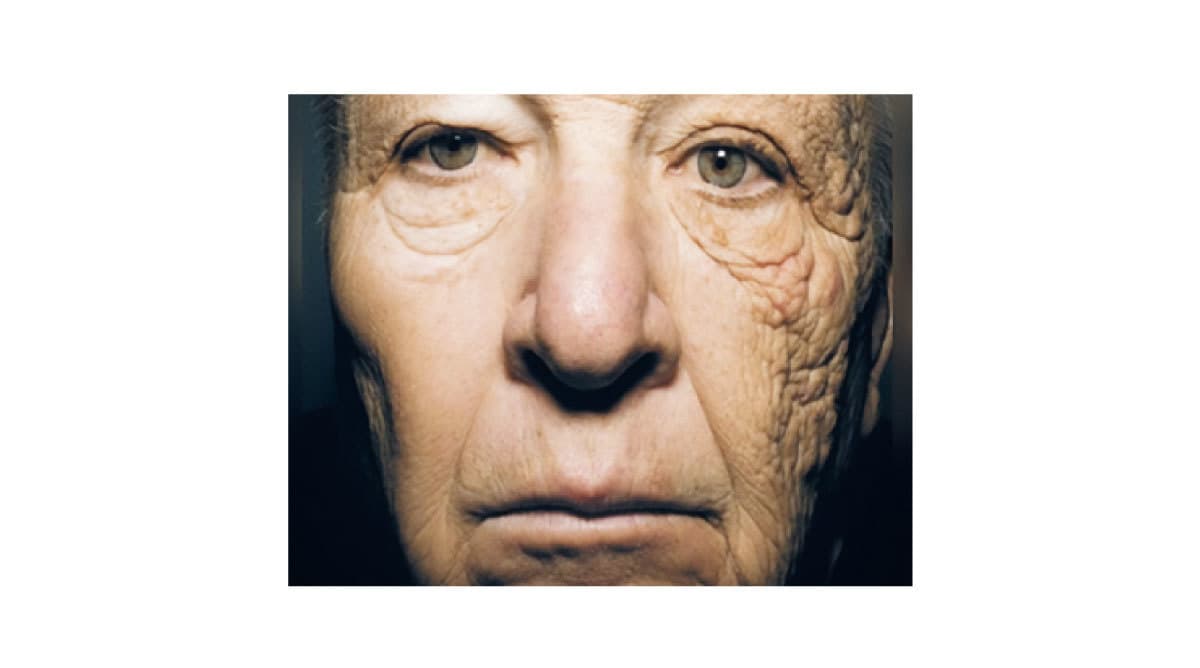 上の写真は28年間トラックの運転手をしていた69歳男性です。向かって右は窓側からの直射日光を浴びた影響で左よりも何倍も老けた印象になっています。