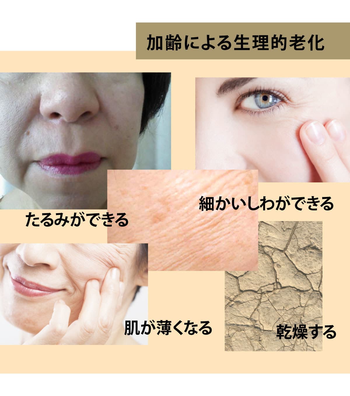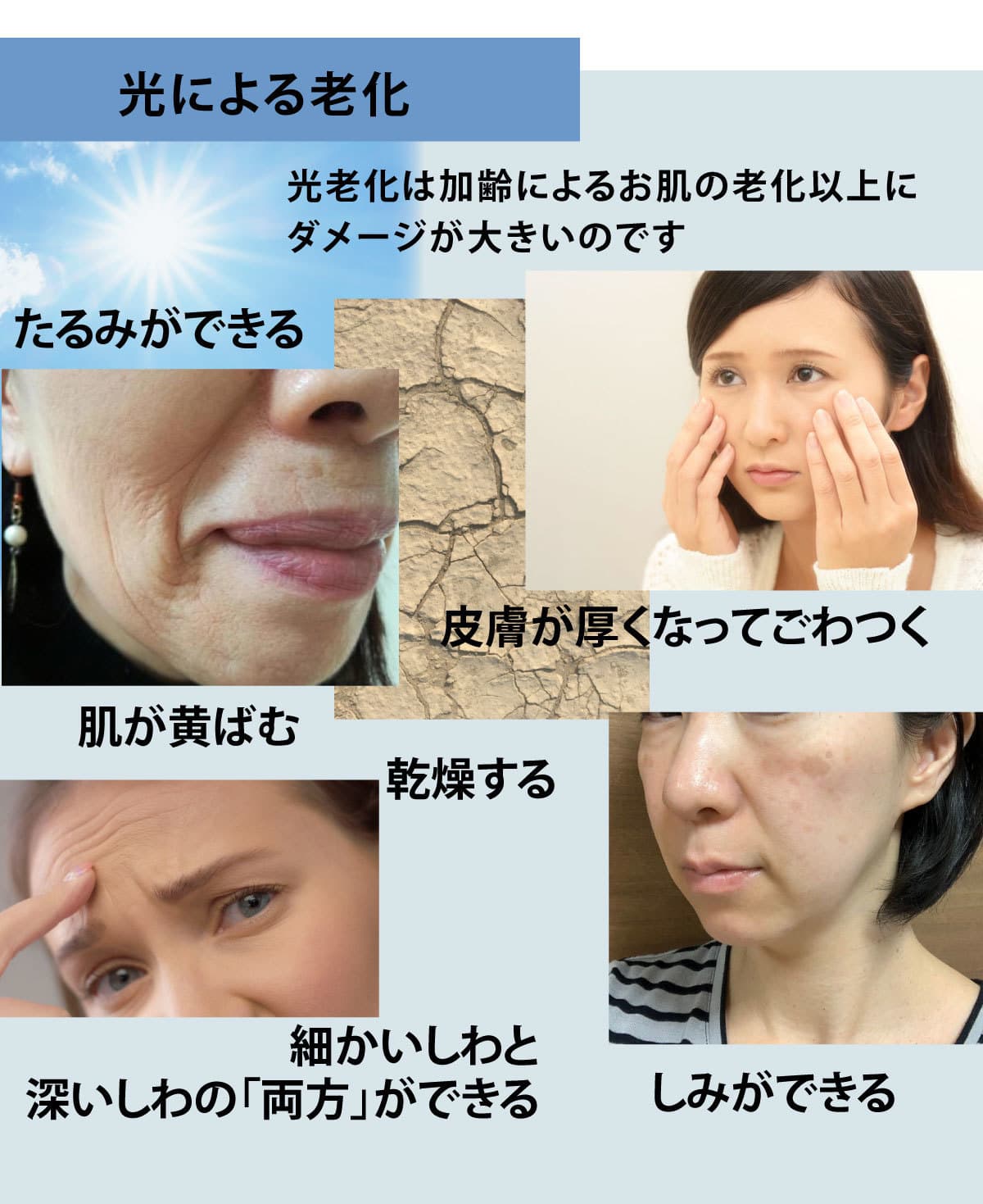 紫外線によるお肌の老化のことで、お肌の老化の原因の約80%占めています。老化には「加齢による生理的老化」と「光老化で現れる症状」の つがあり、光老化は加齢によるお肌の老化以上にダメージが大きいので、しっかり予防することが大切です。