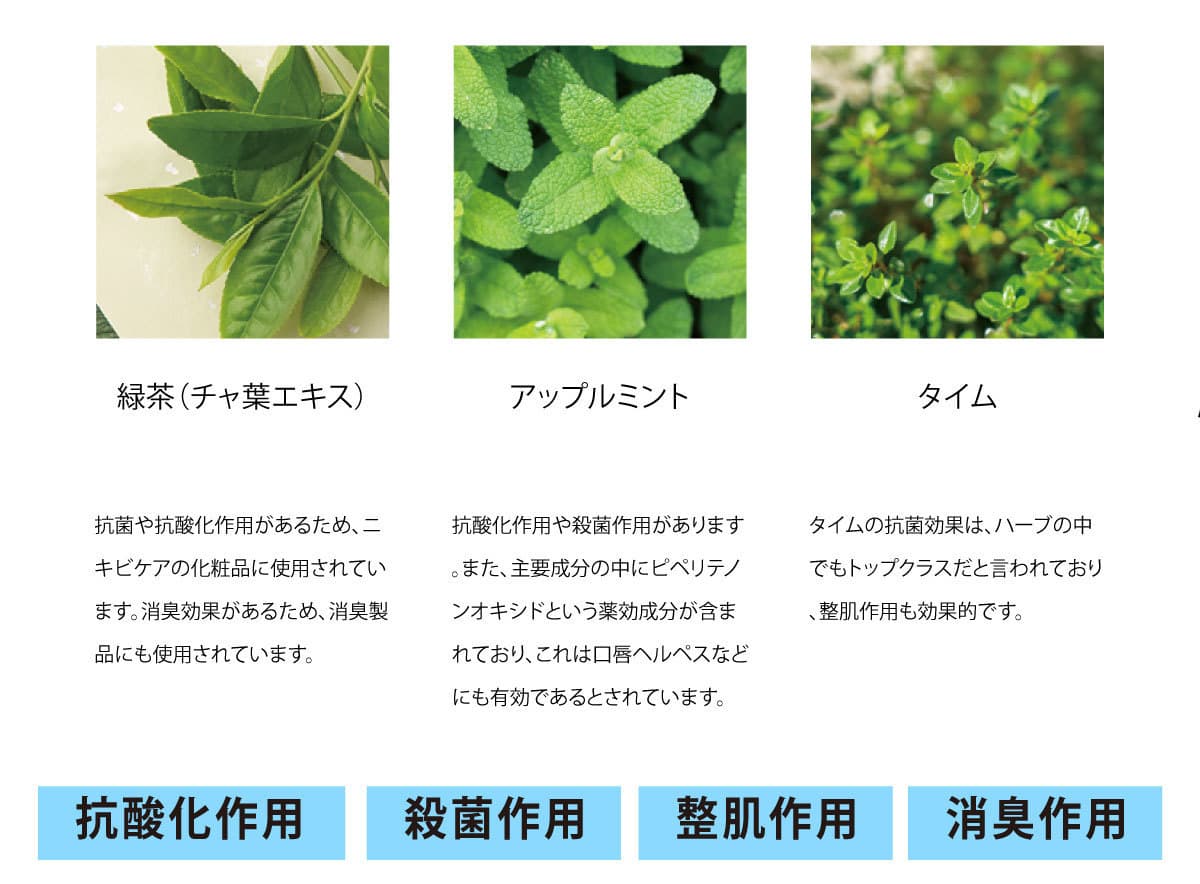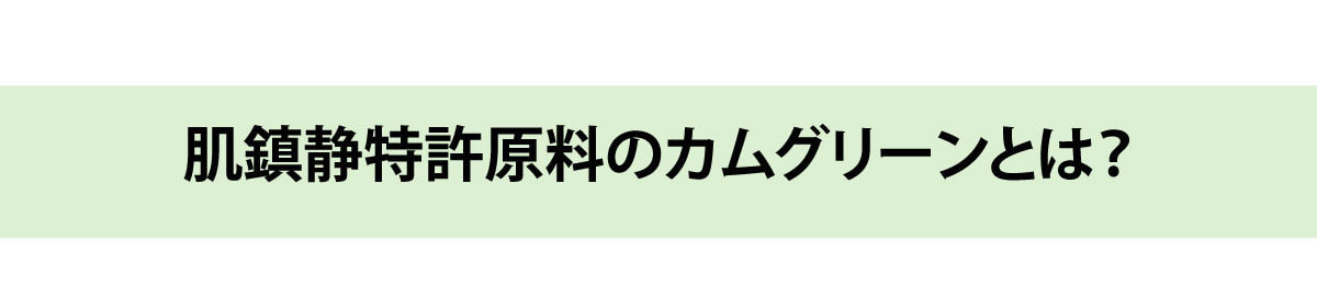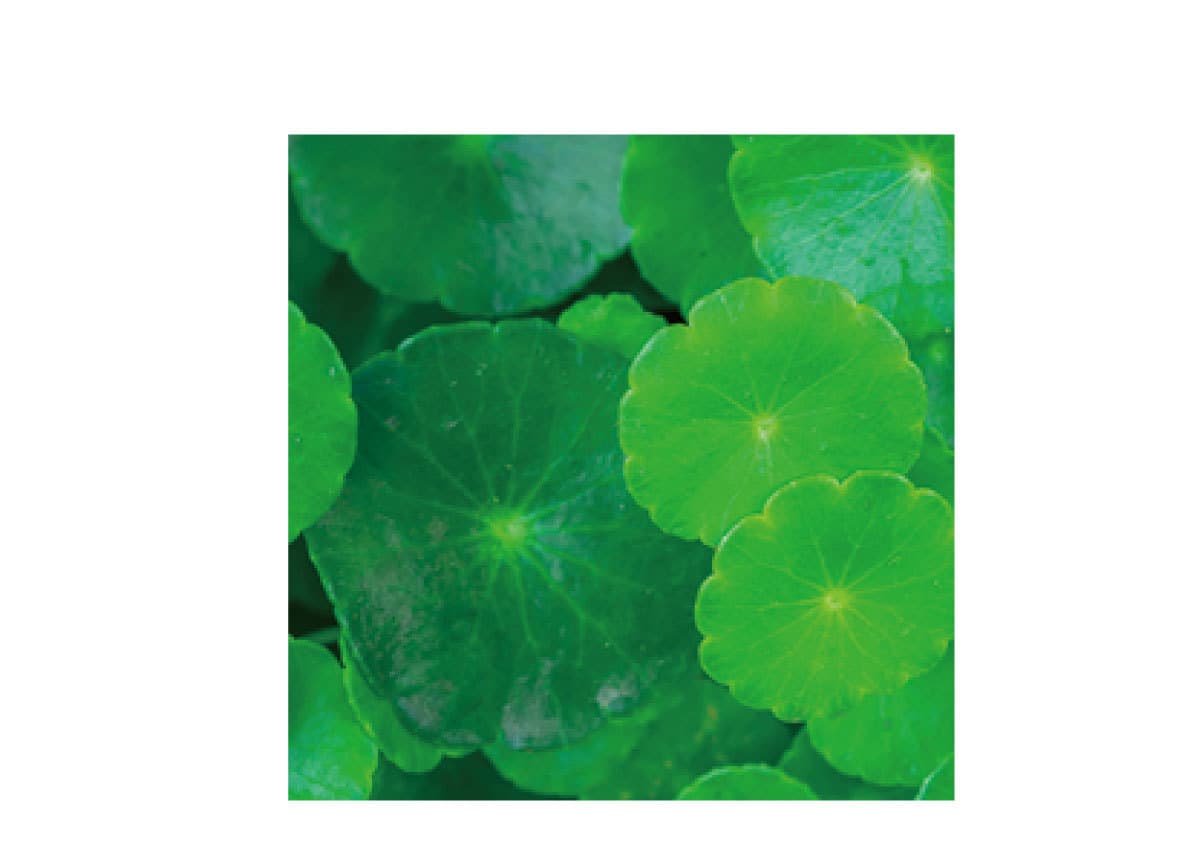 緑茶、アップルミント、タイムの3種類の緑葉エキスを配合した肌鎮静特許原料です。トラブルなどで、敏感になって熱くなった皮膚に効果的です。