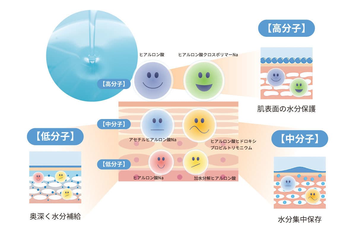 高/中/低分子の 種類のヒアルロン酸水分が必要な角層の隅々に浸透し、水分蒸発を防ぎ、隙間なく保存。 理想的な肌状態を保ちます。