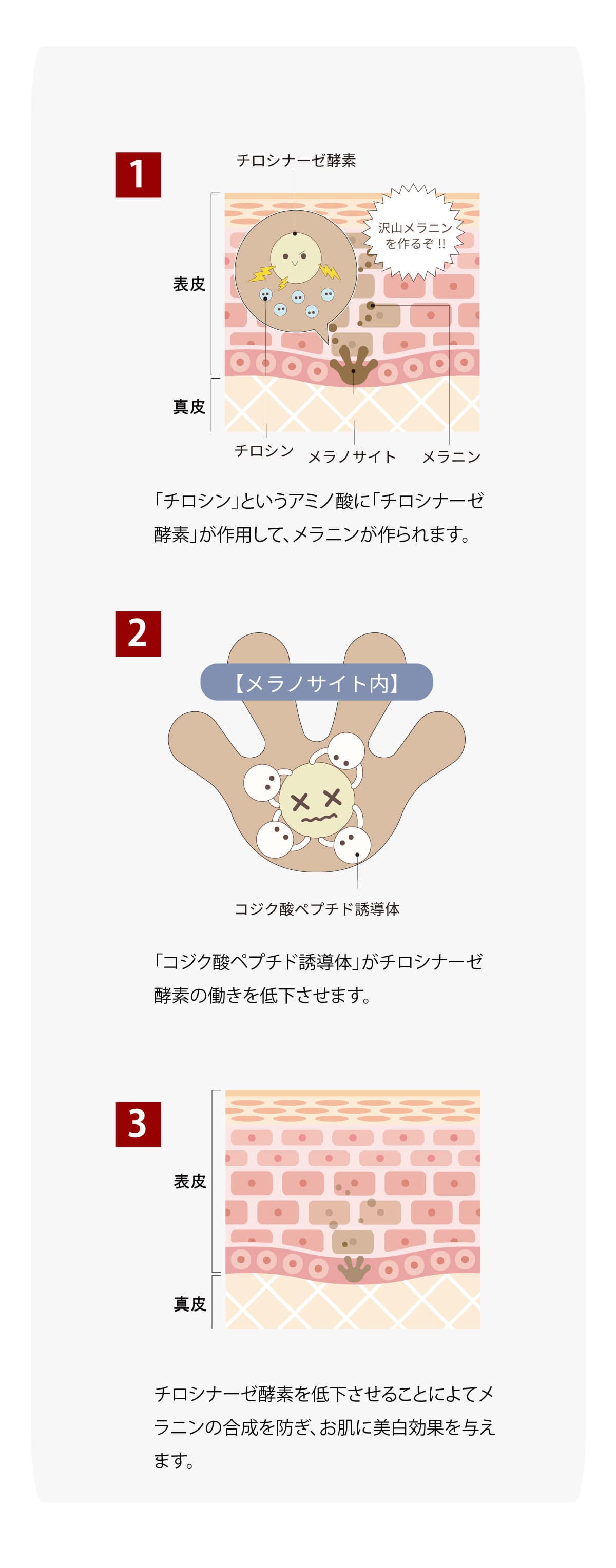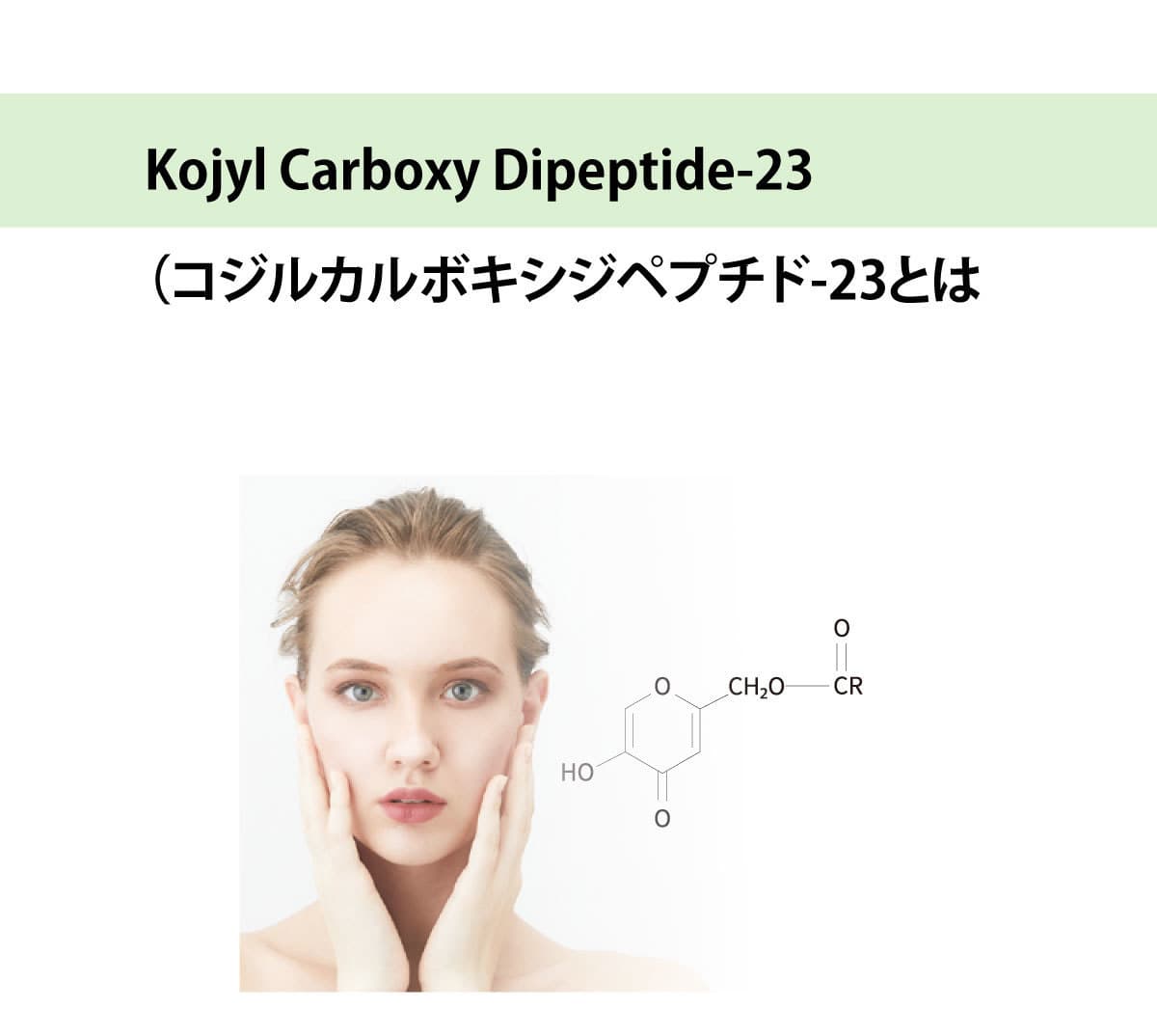 「コジク酸」とペプチドを結合して、安定性と美白効能が向上したものが、『コジク酸ペプチド誘導体(コジルカルボキシジペプチド-23)』です。チロシナーゼ酵素を低下させることによってメラニンの合成を防ぎ、お肌に美白効果を与えます。